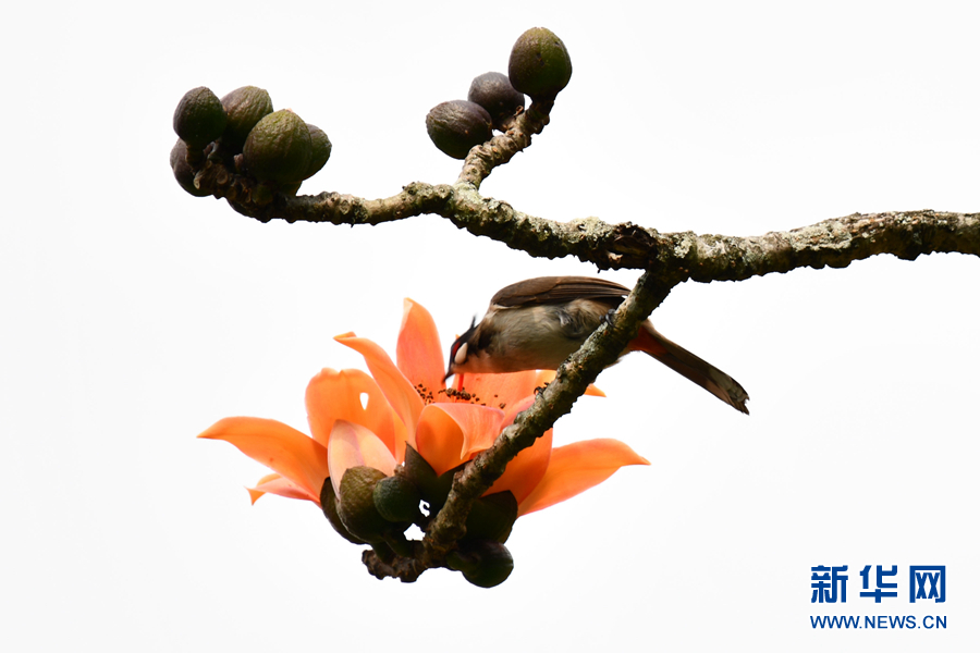 2月29日,广西宁明县亭亮镇梅湾村一株木棉树上,一只黑头翁在叮食木棉花蕊。(新华网发 周贻刚 摄)