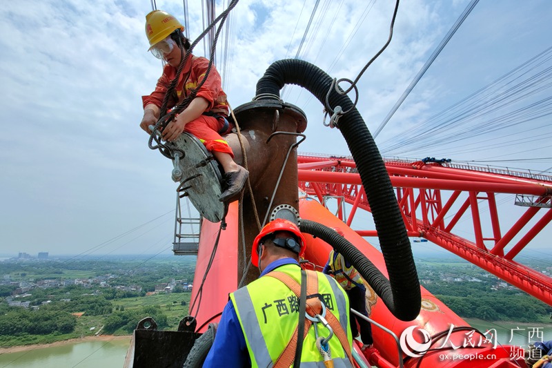 据介绍,平南三桥全桥主弦管共8根,采用真空辅助四级连续泵送工艺,泵送最高点距江面140m,分8次进行灌注,历时26天完成。全桥8根主弦管如果衔接到一起,长度可达2595m,共灌注管内混凝土合计7408m?,需约770辆次混凝土罐车进行运输,平均每8分钟可完成一车次混凝土灌注。