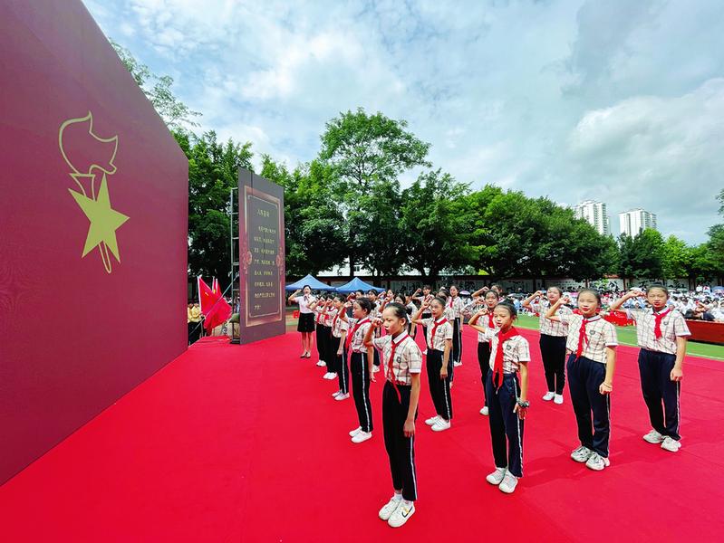 南宁各级少先队组织高举队旗跟党走,传承红色基因,推动南宁少先队事业在新时代实现新发展。图为少先队员重温入队誓词。 南宁日报记者黄红锦摄