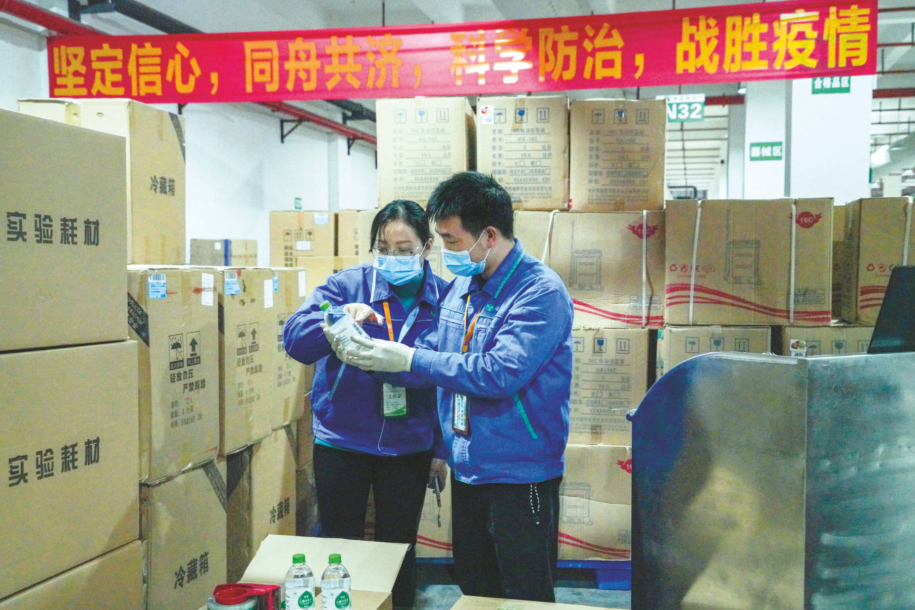 2月10日,在广西南宁柳药药业有限公司物流中心2号库,南宁柳药物流中心部长彭艳兰正在对防疫物资进行清点核查、统筹调配。医用口罩、防护服、鞋套、消毒水等防疫物资分类摆放在相应区域内,佩戴口罩、身穿工作服的工作人员推着拣选车熟练地分拣货物。这些防疫物资经过来货验收、拣货、内复核、打包、外复核、出库、清点等一系列流程后,再被快速装车、运往最需要它们的地方。