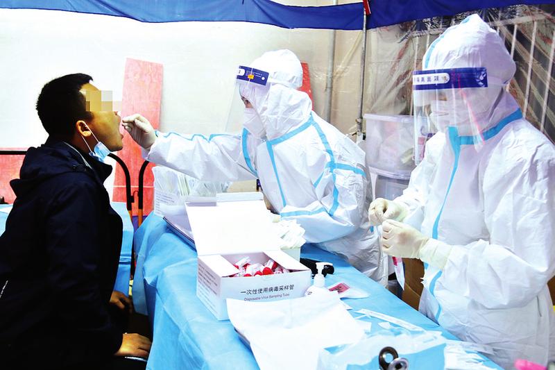 南宁市第三人民医院医务人员在心圩街道核酸检测采样点为群众进行核酸采样。 (王美玲 摄)