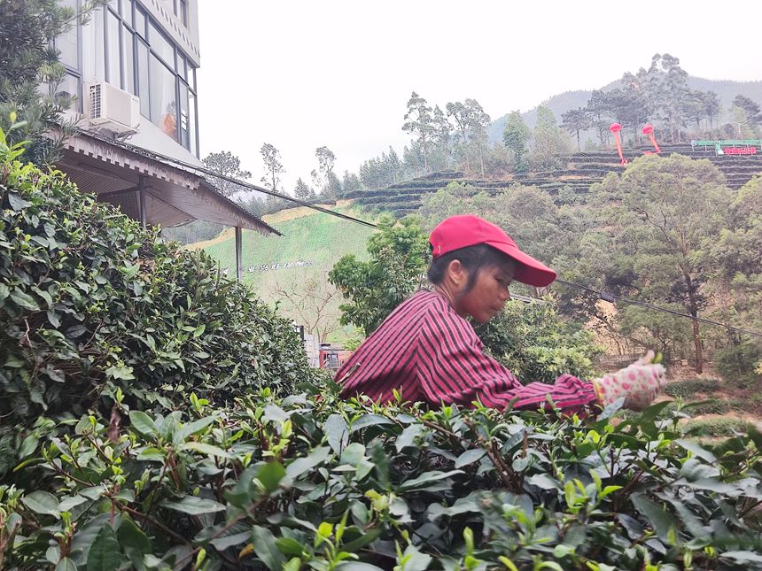 工人正在采摘茶叶。覃塘区融媒体中心供图