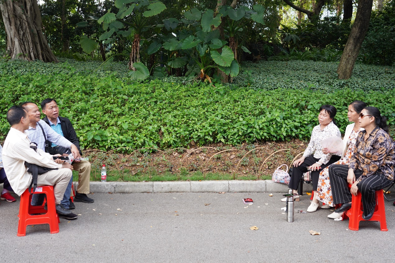 鱼峰公园内,柳州市民在道路旁对唱山歌 摄影 梁章晖