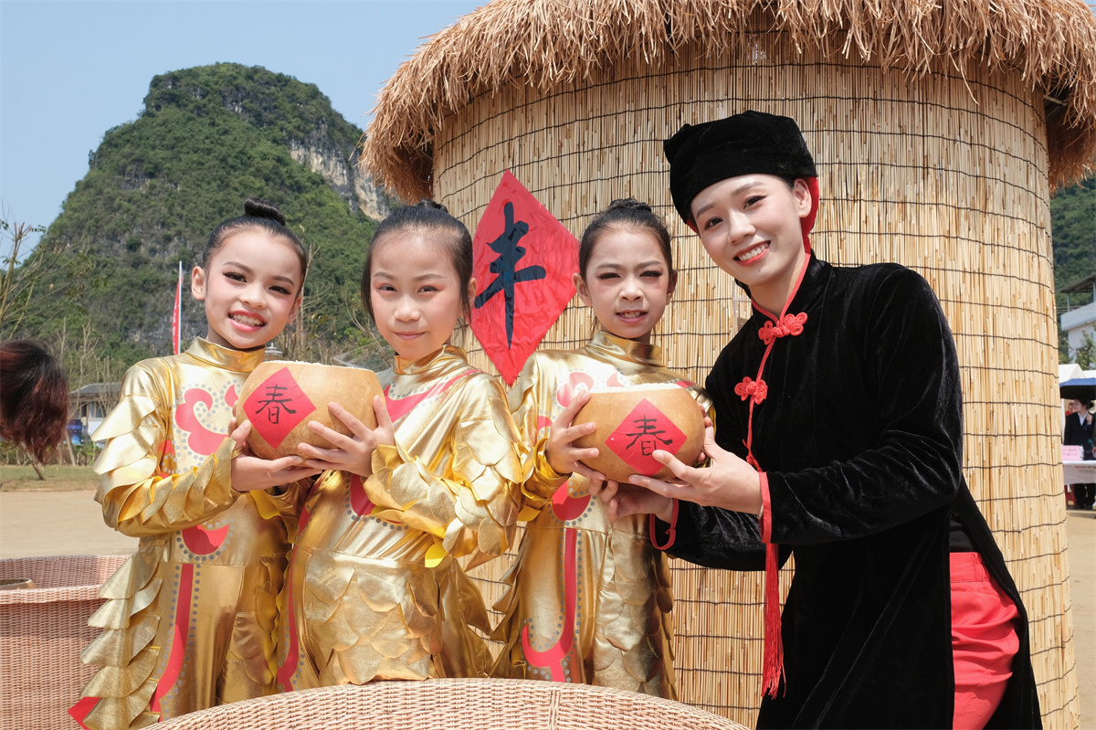 春龙仰首万象启新,千人长桌叙情谊,百人天琴唱未来。在“万家祈福庆丰收”活动现场,中越嘉宾与游客将稻谷倒入铜鼓粮仓中添粮祈福,身穿民族服饰的当地壮族“呗侬”们将一个个祈福福袋回赠给嘉宾游客,寓意五谷丰登,来年幸福;伴随着美妙动听的天琴弹唱和千人歌舞《敬酒歌》,大家围坐长桌品鉴传统美食,把酒言欢,共叙情谊。