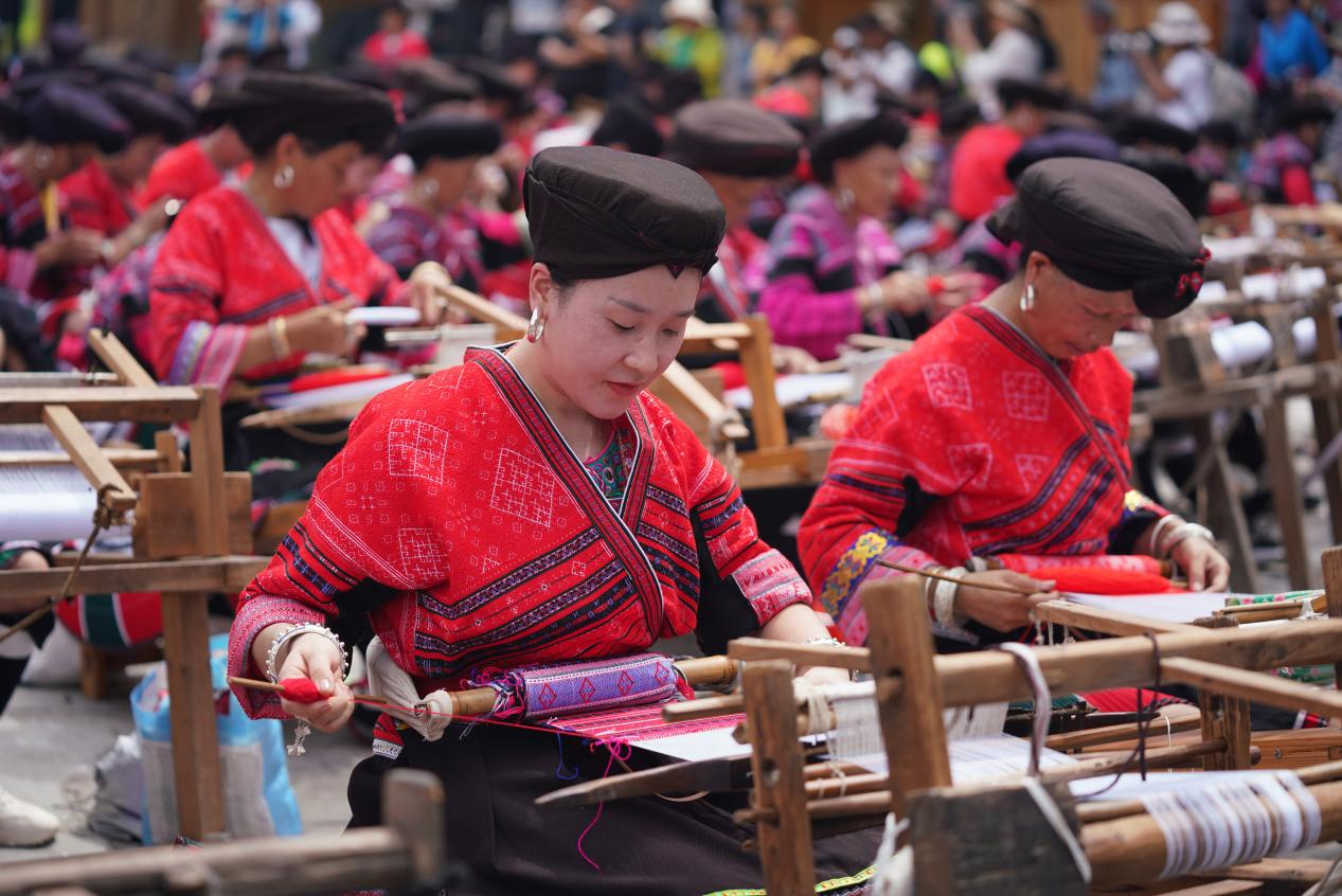 瑶族妇女向游客展示红瑶服饰的制作工艺 摄影 韦吉阳