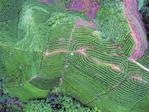 金秀瑶族自治县重点打造“柑橘、茶叶、杉木、竹笋、生态鸡、中药材、油茶”“5+2”特色产业,形成山内乡镇发展“茶叶+”和“中草药+”为主、山外乡镇发展“水果+”为主的多套餐产业扶贫模式,提前实现“山外人均1亩果,山内人均1亩茶”的目标。图为该县金秀镇六段村连片茶园。苏呈祥/摄