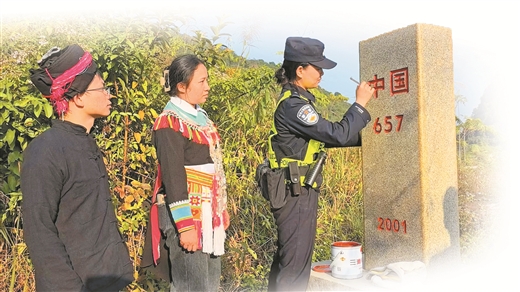 民警和群众一起为界碑描红。 莫礼亮/摄