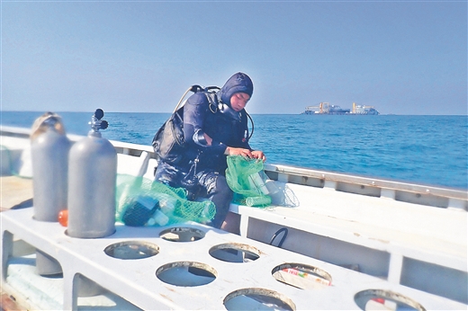 海缆施工期间,潜水员下海采集样本。王欣/摄