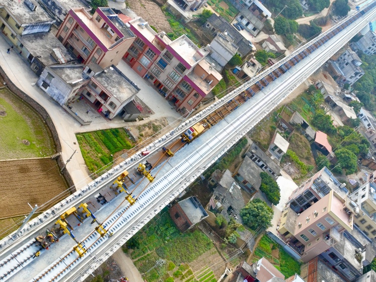 南珠高铁玉林北至岑溪东段沿线地形地貌复杂,桥隧比达84.4%,长钢轨运输和铺设多次跨越既有铁路、公路。为安全高效推进铺轨施工,广西南玉铁路有限公司、南宁铁路工程建设指挥部联合参建单位中铁二局科学制定长钢轨运输及铺轨施工方案,克服邻近既有线和营业线施工安全压力大等诸多困难,投入本邻双线铺轨机等机械设备,借助信息化调度中心,实时传输前线动态、科学调度作业布局、自动判断施工风险并发出预警,实现项目管理的智能化、信息化、专业化,提升了轨道铺设的速度和质量,确保工程施工安全。