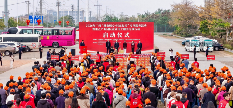 2月22日,农历正月初六,广西壮族自治区人力资源和社会保障厅联合自治区工业和信息化厅、自治区产业园区改革发展办公室、自治区总工会及南宁市人民政府,在南宁邕宁新兴产业园区共同举办2026年广西“就业暖心·桂在行动”专项服务活动暨重点产业园区企业用工服务专项行动启动仪式。