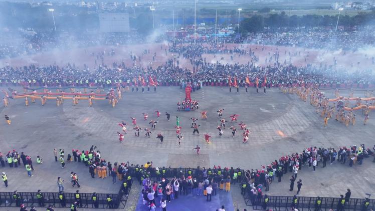 活动现场,广西南宁市宾阳县炮龙文化广场沿线人头攒动。活动开始,率先登场的潮汕英歌舞以“中华战舞”之姿震撼全场,舞者面绘水浒英雄脸谱,身着劲装,手持英歌槌铿锵对击,在大鼓、铜锣、铜钹的激越节奏中,步伐刚劲、阵型变幻,呐喊声与槌击声交织,让观众沉浸式感受岭南非遗的雄浑气魄。紧随其后,宾阳炮龙惊艳亮相,将现场氛围推向高潮。