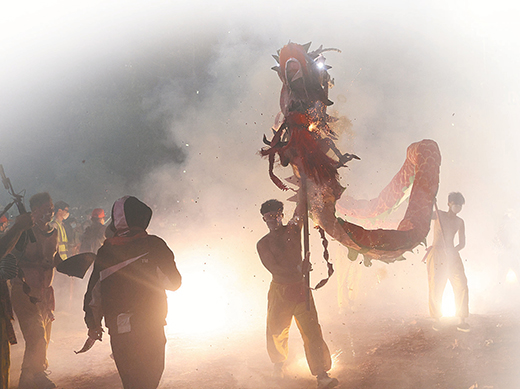 正月十一晚,靖安街的炮龙阵里,57岁的舞龙手廖国维赤膊上阵,他双手紧握龙杆,带领龙队在漫天炮火中穿梭。