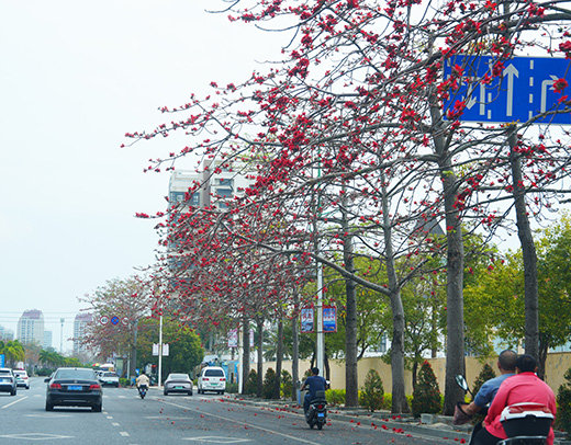 北海街头的木棉花盛开,火红的花朵开满枝头。 广西云-广西日报记者何兴强/摄