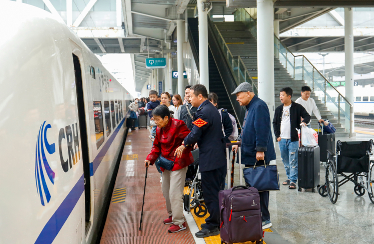 桂林北站工作人员护送老年旅客乘车 摄影 郑长贤