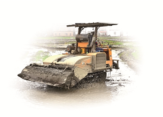 宾阳县新桥镇三友村农户使用农机耙田。 广西云-广西日报记者周映/摄