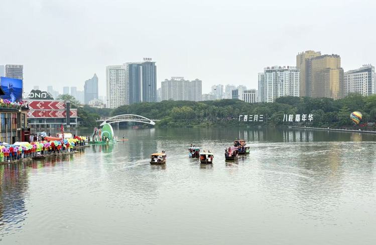 4月18日上午,2026年“广西三月三·八桂嘉年华”文化旅游品牌活动在南宁民歌湖启幕。活动以“三月三 趣广西”为主题,围绕“科技味、时代感、广西味、东盟味”主线,精心设置“五土润柳·铸同心”“一马当先·争上游”“世界同唱·三月三”“智启未来·AI岛”“国风非遗·新焕境”“爱在南宁·悦生活”“果力全开·创客坡”七大单元,打造“水陆空”立体展演,让传统节日变身沉浸式新体验,尽显传统与未来交融的广西魅力。(文/图 傅珊珊)